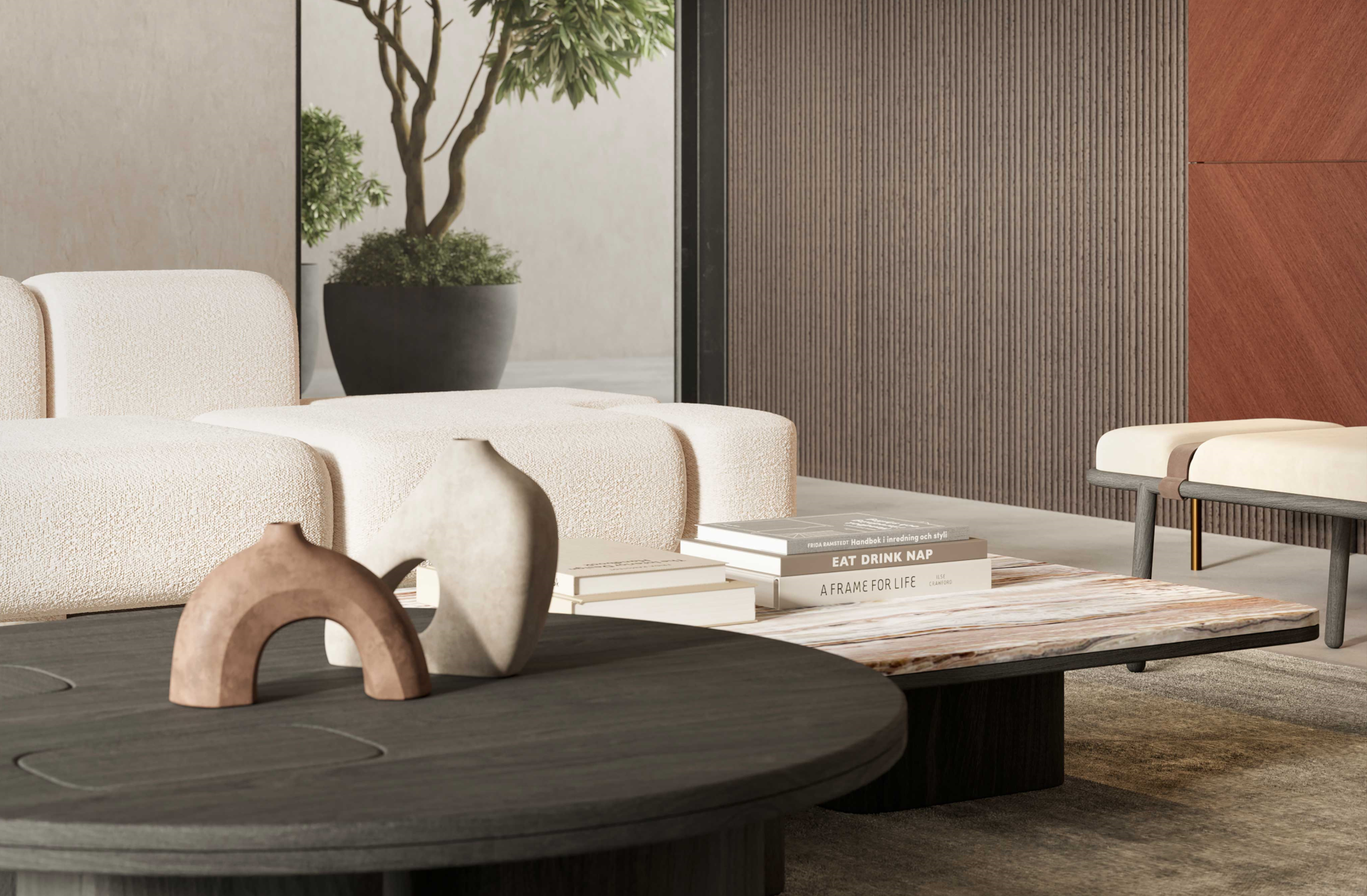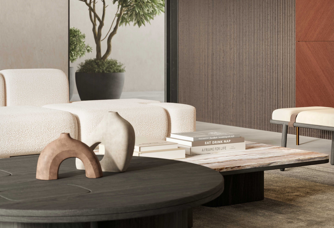 Ma il trend è sicuramente caratterizzato dall'utilizzo delle sedute dalle forme morbide con tessuto bouclè e colori neutri, dai materiali naturali come il legno non solo per gli arredi ma anche per le finiture a parete e dal ritorno del marmo proposto come finitura per i tavoli.