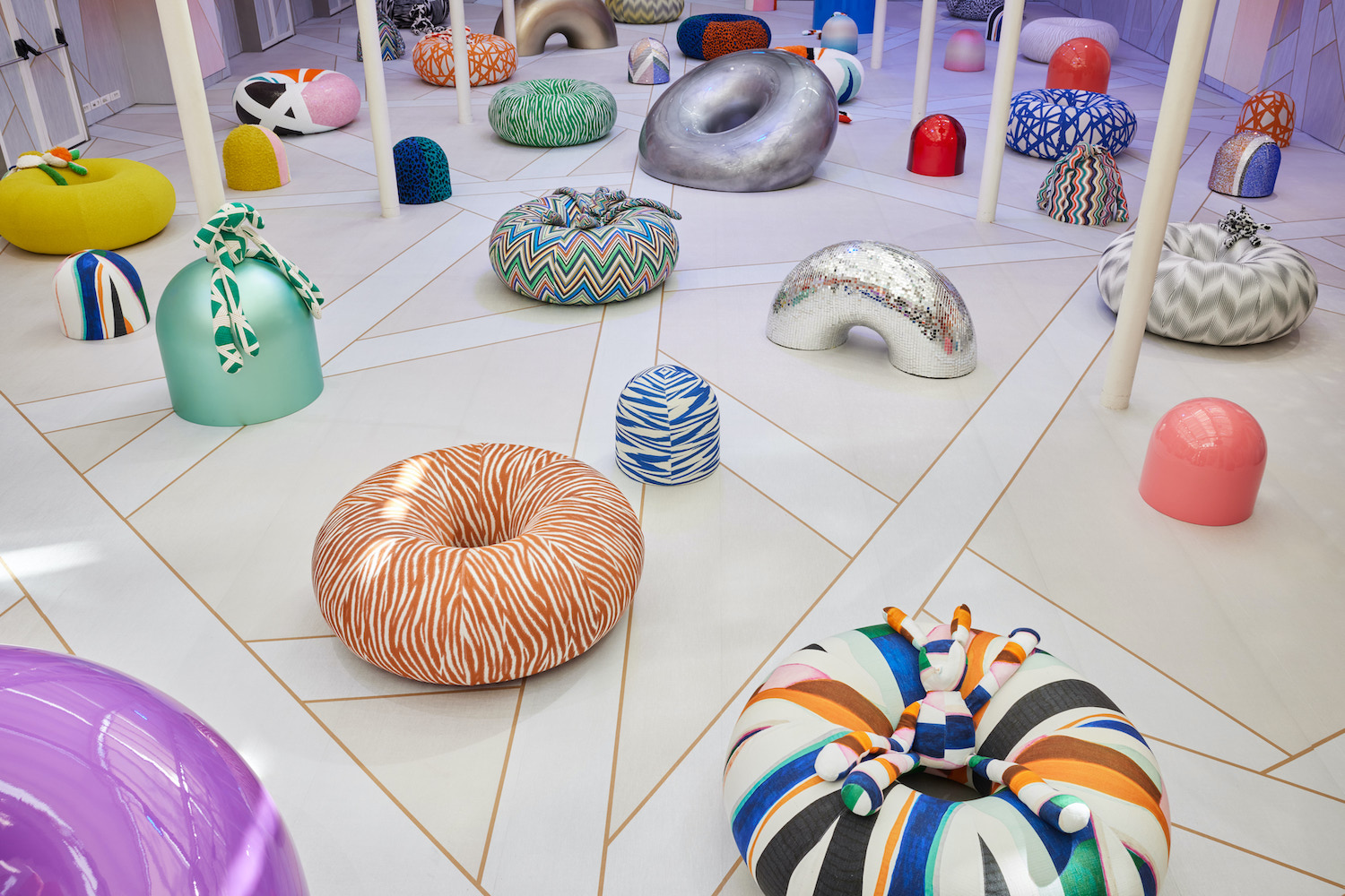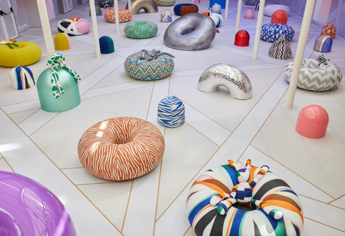 A questo si accosta un filone fatto di tanta fantasia nei wallpapers, da quello raffinato presentato da Glamora ispirato alla Madama Butterfly di Puccini a quello provocatorio di LondonArt caratterizzato da colori forti e dai soggetti pop della nuova collezione. Ma in fatto di parati emergono anche i colori allegri e freschi della collezione Missoni Home che ho ritrovato anche nei tessuti utilizzati nell'allestimento dello showroom della Maison al Fuorisalone di Brera caratterizzato da grandi ciambelle che fanno da sedute pouf. Il risultato è un'atmosfera ironica, allegra e supercolorata.